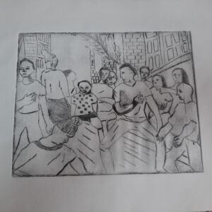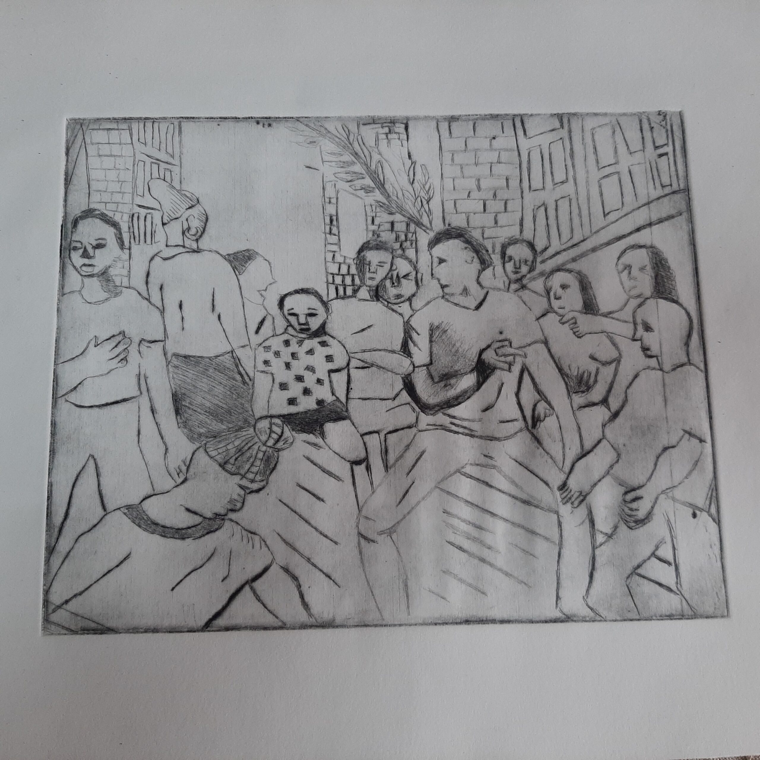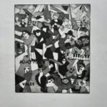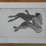 Avec la taille d’épargne, on imprime que la partie en relief, autrement dit la partie non creusée du support (qui peut être une planche de bois, un lino, etc.) que l’on a encré au préalable … le contraire du métal où c’est l’empreinte en creux qui est imprimée. La force de pression sur la plaque est moins importante. On pourrait imprimer chez soi, avec une petite presse. La taille d’épargne permet moins de subtilités que le métal … mais elle dégage selon moi une force, un rapport plus immédiat, brut, avec le contemplateur de l’oeuvre.
